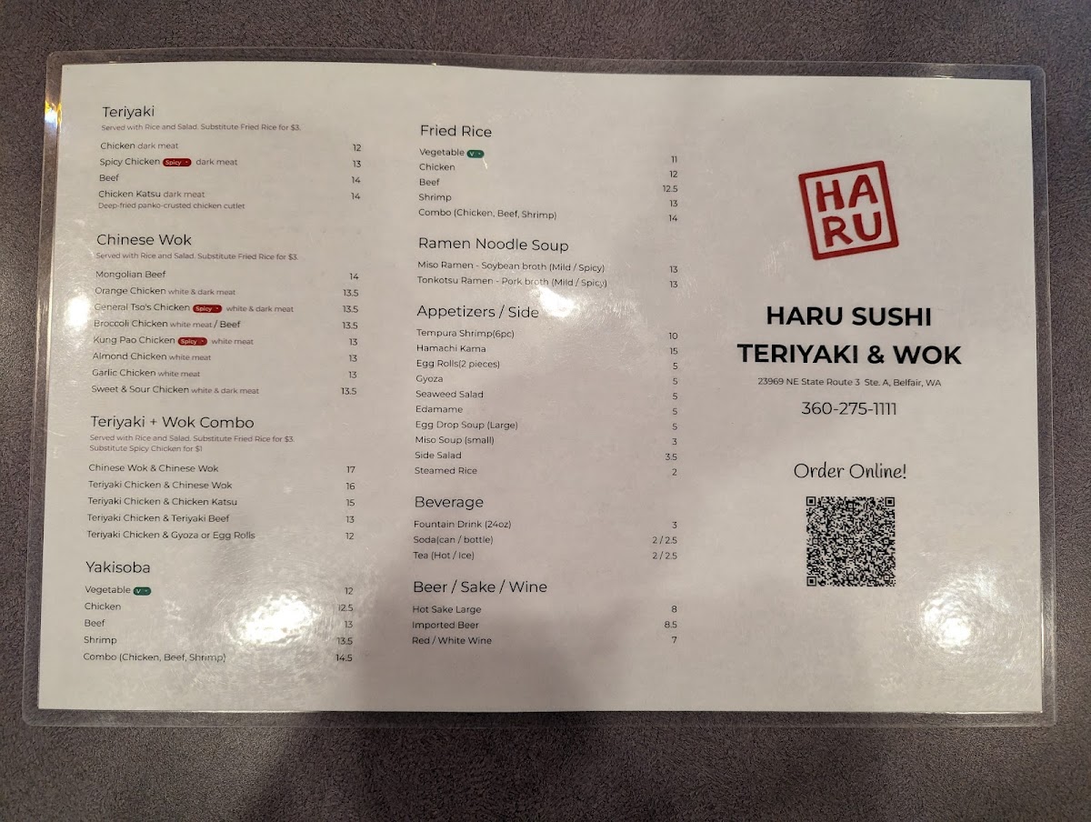 Welcome to Haru Sushi Teriyaki & Wok, a hidden gem nestled in Belfair, WA. This eatery is a delight for sushi lovers and fans of Asian cuisine alike. With a diverse menu featuring standout items like the Sunrise Roll and Dragon Roll II, guests are treated to a symphony of flavors that combine fresh ingredients with masterful technique.